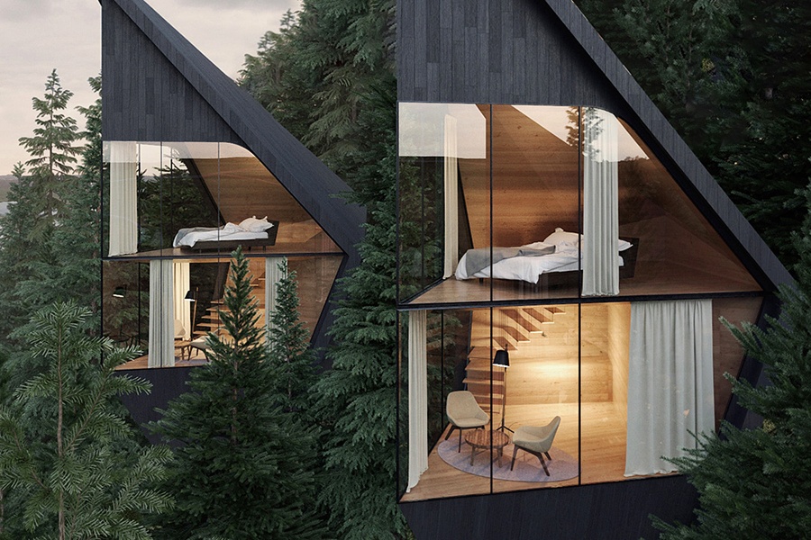 几何形状的屋顶,其灵感来自于周围的冷杉和落叶松外形。树屋本身也是由当地的木材制成,这让树屋和周围的环境更好的融合在一起,从而确立了项目的可持续性。